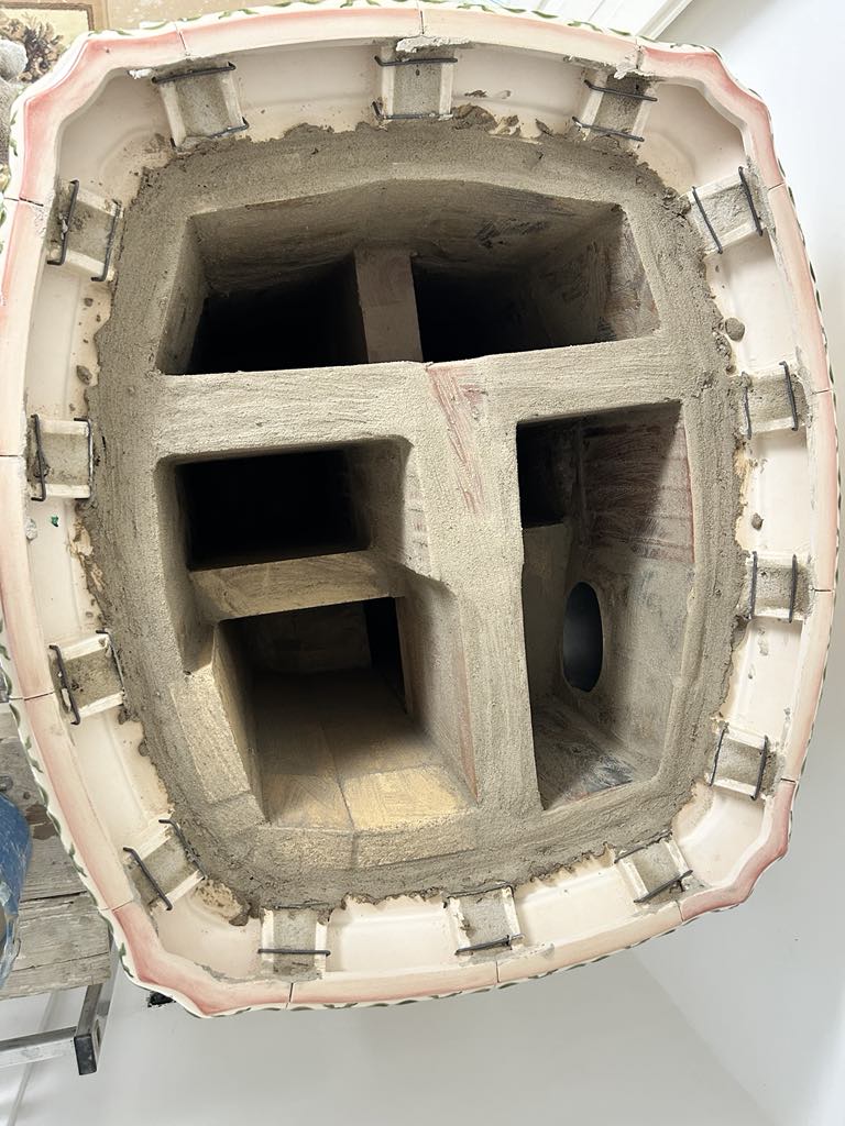 Azt, hogy belül tovább növeljük a tömeget és védjük a csempét. A tűztérnél vastag samottot használunk, az első járatokban vékonyabb samottot, az utolsó járatokban pedig cserepet. A tűztérnél azért kell a vastag samott, hogy a hőlökést és a magas hőmérsékletet hosszú távon is bírja.
